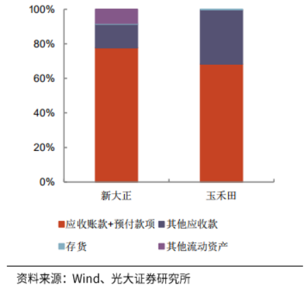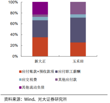 對(duì)比環(huán)衛(wèi)運(yùn)營企業(yè)玉禾田和公建物業(yè)企業(yè)新大正,營業(yè)成本結(jié)構(gòu):新大正80%以上為人工成本,成本占比約等于玉禾田的人工成本和折舊攤銷+設(shè)備使用費(fèi)占比之和;流動(dòng)資產(chǎn)結(jié)構(gòu)(除現(xiàn)金外):主要構(gòu)成為應(yīng)收款+預(yù)付款;流動(dòng)負(fù)債結(jié)構(gòu)(除短期借款外):主要構(gòu)成為應(yīng)付賬款+預(yù)收款、應(yīng)付職工薪酬。