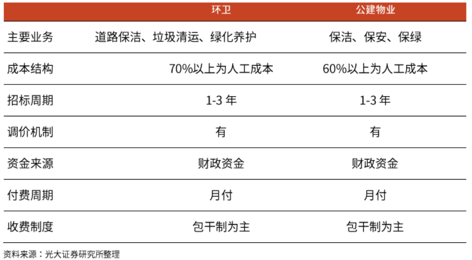 我們認(rèn)為,環(huán)衛(wèi)行業(yè)與公建物業(yè)的商業(yè)模式有著相似之處。兩者的主要業(yè)務(wù)都是圍繞一定的基礎(chǔ)設(shè)施/固定資產(chǎn),開展以保潔為主的維護(hù)性工作。