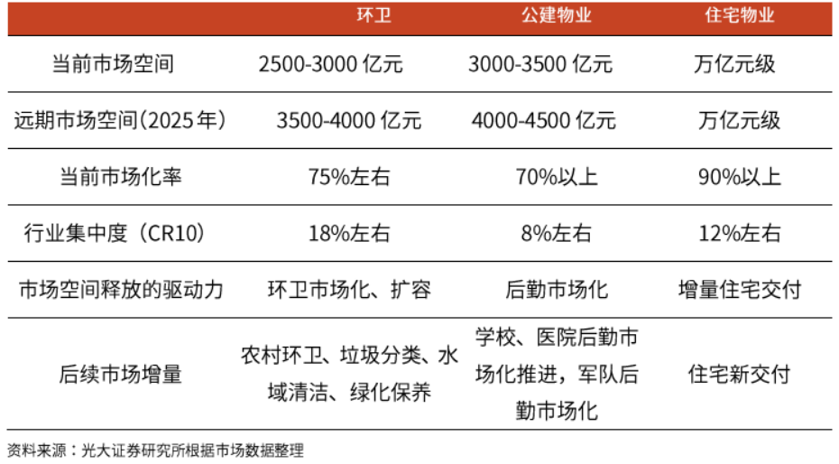 ▼表11:環(huán)衛(wèi)業(yè)務(wù)、公建物業(yè)、住宅物業(yè)的市場(chǎng)空間對(duì)比