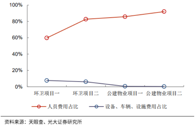 這決定了兩者都屬于人力密集型業(yè)務(wù),在成本結(jié)構(gòu)中人工成本占比60%以上。通常以1-3年為一個(gè)招標(biāo)周期,按月支付費(fèi)用(最終來源為財(cái)政資金)。目前兩者都以包干制為主要收費(fèi)模式,單價(jià)確定后盈虧自負(fù),重點(diǎn)考驗(yàn)企業(yè)的成本控制能力和管理能力。