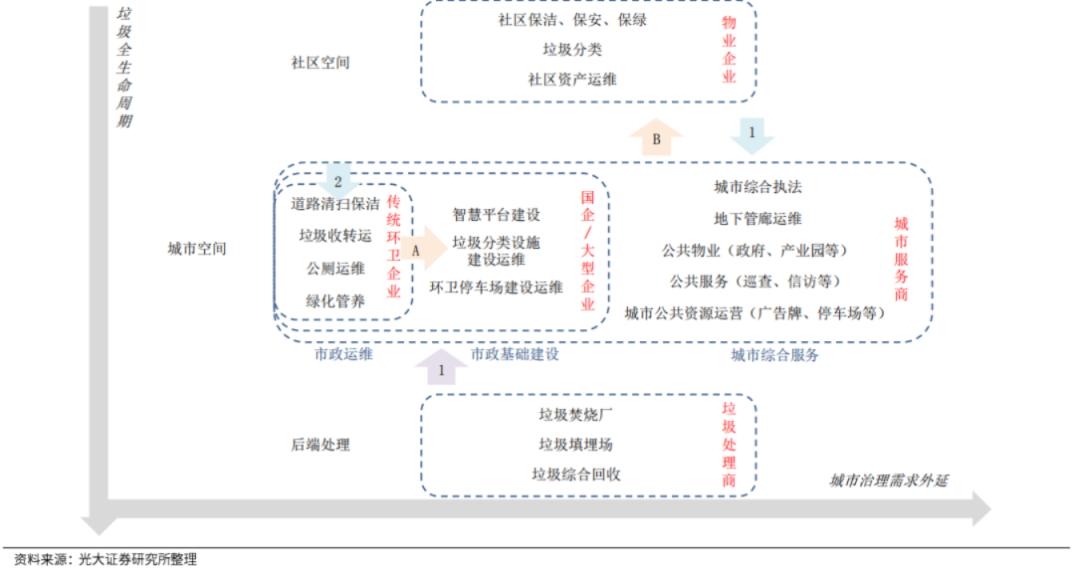 在當(dāng)前的競(jìng)爭(zhēng)格局下,沿著“垃圾全生命周期”和“城市治理需求外延”兩條主線,環(huán)衛(wèi)正在成為“中間地帶”。