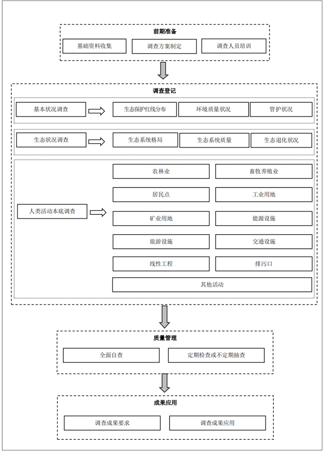 縣級(jí)及以上生態(tài)環(huán)境部門(mén)應(yīng)結(jié)合本地實(shí)際,根據(jù)監(jiān)管基礎(chǔ)調(diào)查的工作流程,編制本行政區(qū)的調(diào)查方案,明確工作目標(biāo)、技術(shù)路線、主要任務(wù)、數(shù)據(jù)口徑、責(zé)任分工、質(zhì)量管理、主要成果和進(jìn)度安排等。其中,涉及海洋生態(tài)保護(hù)紅線的,結(jié)合海洋生態(tài)保護(hù)紅線監(jiān)管需求和生態(tài)保護(hù)紅線監(jiān)管臺(tái)賬數(shù)據(jù)庫(kù)建設(shè)有關(guān)要求,參照GB/T 12763.9確定調(diào)查的主要內(nèi)容和技術(shù)路線。