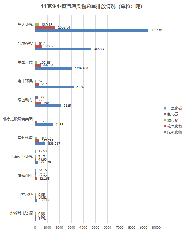 雖然焚燒可以極大減少垃圾量,但伴隨而來(lái)的,也存在有廢氣污染的問(wèn)題。通常,焚燒過(guò)程中的廢氣污染物有:氮氧化物、硫氧化物、顆粒物、氯化氫和一氧化碳。在已發(fā)布ESG報(bào)告的25家企業(yè)中,共有11家有披露廢氣污染物排放情況,披露率為44%,具體如下: