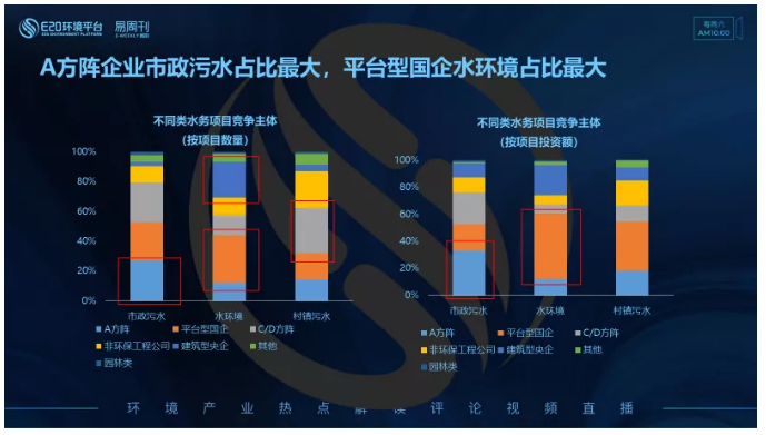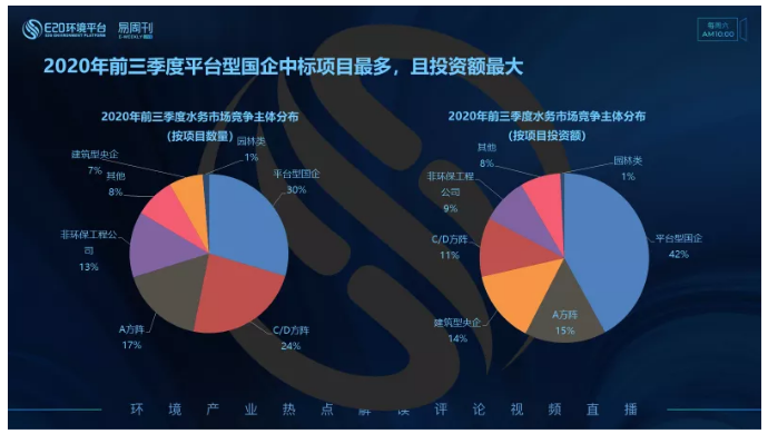 進(jìn)一步分析不同類型競(jìng)爭(zhēng)主體獲取不同類水務(wù)項(xiàng)目的傾向性可以發(fā)現(xiàn):2020年前三季度傳統(tǒng)水務(wù)A方陣企業(yè)在市政污水板塊競(jìng)爭(zhēng)優(yōu)勢(shì)最明顯,無論是項(xiàng)目數(shù)量還是所占市場(chǎng)份額占比均最大,在村鎮(zhèn)污水及水環(huán)境領(lǐng)域市場(chǎng)占比都相對(duì)較小。
