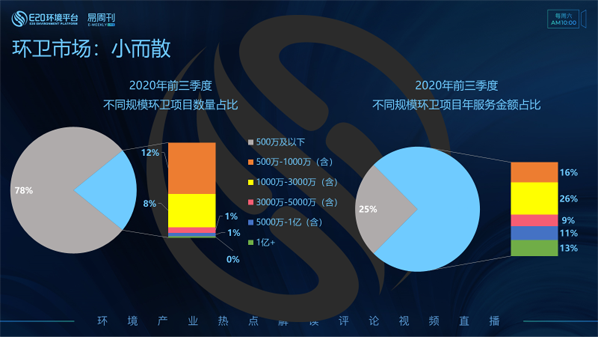 環(huán)衛(wèi)市場小而散的局面依舊沒有改變。2020年前三季度年服務(wù)金額在500萬及以下的環(huán)衛(wèi)項目數(shù)量占整體的78%,而這78%的環(huán)衛(wèi)項目卻只占據(jù)環(huán)衛(wèi)市場份額的25%。