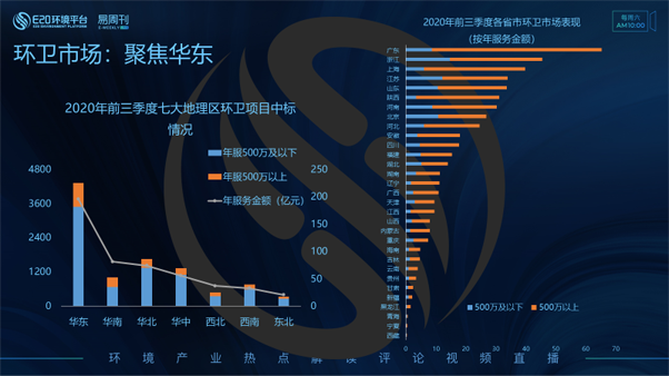 從七大地理區(qū)維度進(jìn)行劃分(左圖),2020年前三季度環(huán)衛(wèi)項目數(shù)量釋放最多的地理區(qū)為一向是環(huán)衛(wèi)市場化的第一陣營的華東地區(qū);其次為華北和華中地區(qū)。按年服務(wù)金額排名前三的地區(qū)分別為:華東地區(qū)、華南地區(qū)和華北地區(qū)。