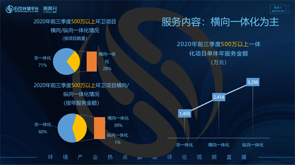 左下圖,2020年前三季度500萬以上環(huán)衛(wèi)項目橫縱向一體化情況,按照年服務(wù)金額劃分,可以看到非一體化環(huán)衛(wèi)項目所占市場份額約60%,橫向、縱向一體化環(huán)衛(wèi)項目的年服務(wù)金額總額占到整體份額的40%。