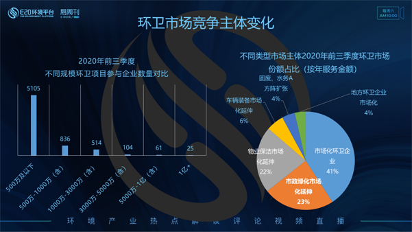 E20研究院對每家環(huán)衛(wèi)企業(yè)的來源都進(jìn)行分類和貼標(biāo)簽,大致分為市場化環(huán)衛(wèi)企業(yè)、物業(yè)保潔市場化延伸、市政綠化市場化延伸、車輛裝備市場化延伸、地方環(huán)衛(wèi)企業(yè)市場化和固廢、水務(wù)A方陣擴(kuò)張。右圖為不同類型市場主體前三季度環(huán)衛(wèi)市場份額占比,其中占比最高(41%)的是市場化環(huán)衛(wèi)企業(yè);其次為市政綠化市場化延伸及物業(yè)保潔市場化延伸類企業(yè)所獲市場份額較多,占比分別為23%和22%。