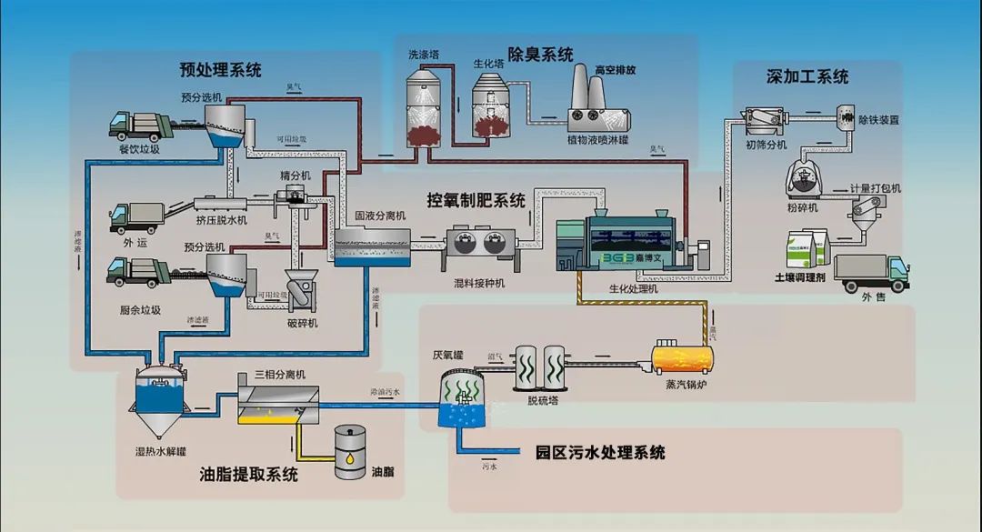 項(xiàng)目采用嘉博文公司好氧+厭氧發(fā)酵工藝和BGB-SCZ-7500型大設(shè)備處理系統(tǒng),主工藝為有機(jī)廢物生物強(qiáng)化腐殖化和控氧制肥系統(tǒng),充分利用餐廚廢棄物固相中的營養(yǎng)成分,快速降解為生物腐植酸;輔助工藝采用高濃度有機(jī)液相厭氧發(fā)酵,產(chǎn)生沼氣可供給鍋爐燃燒回用于工藝用熱,實(shí)現(xiàn)沼氣的自身循環(huán)利用;沼液進(jìn)入污水處理,沼渣回進(jìn)控氧制肥系統(tǒng)。