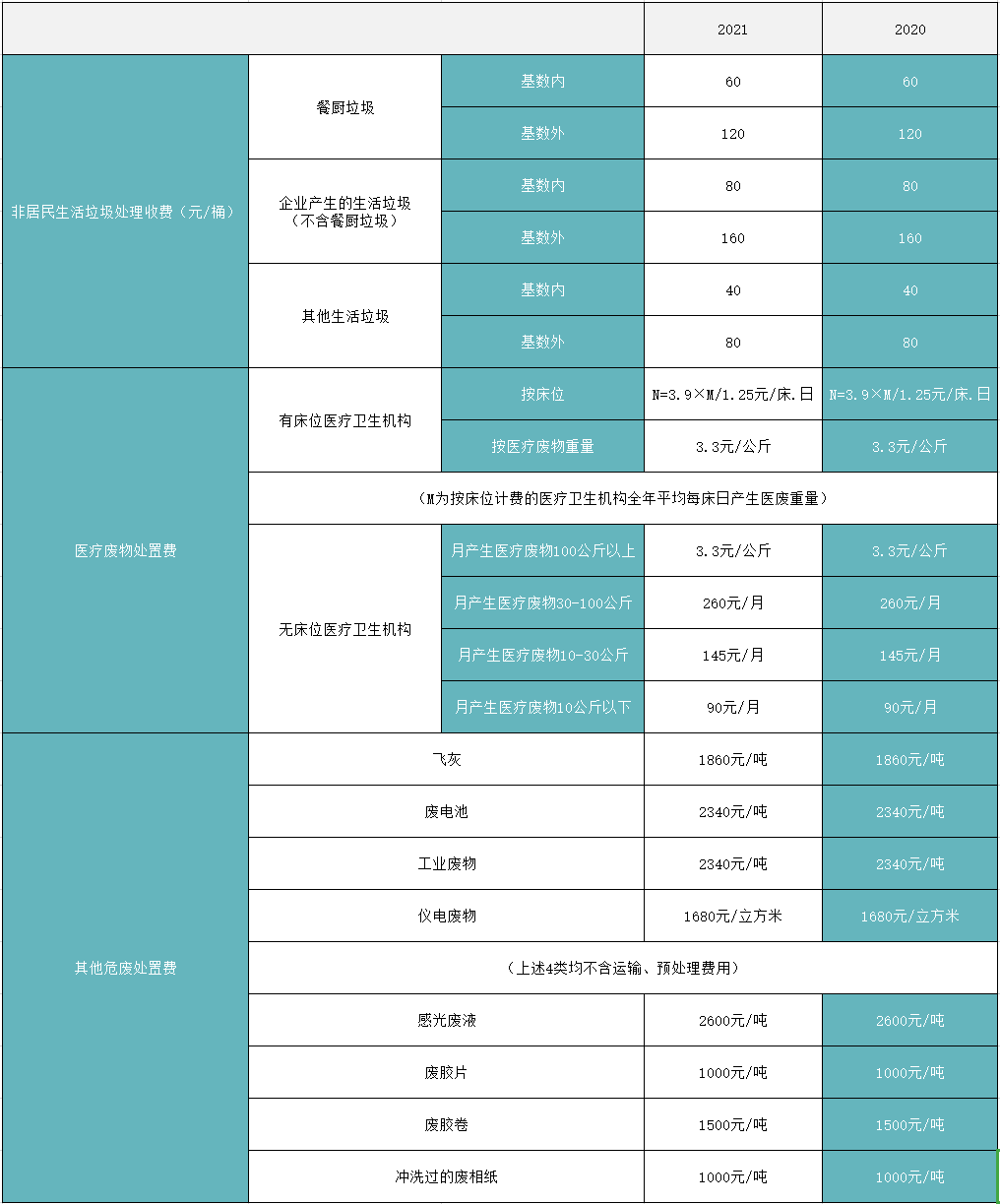 與2020版相比,非居民生活垃圾處理收費標準和危廢處置收費標準沒有變化。