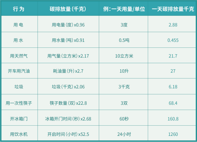 手冊中列舉了一些常見的生活行為排放的二氧化碳量: