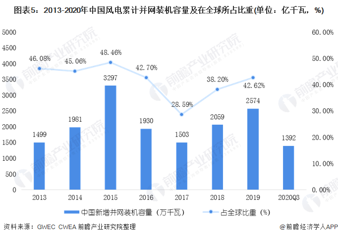 根據(jù)GWEC的數(shù)據(jù)顯示,2019年,中國(guó)新增并網(wǎng)裝機(jī)容量為2574萬(wàn)千瓦,新增裝機(jī)容量在全球比重為42.62%。在2020年前三季度,中國(guó)風(fēng)電新增并網(wǎng)裝機(jī)1392萬(wàn)千瓦,其中陸上風(fēng)電新增裝機(jī)1234萬(wàn)千瓦、海上風(fēng)電新增裝機(jī)158萬(wàn)千瓦。從新增裝機(jī)分布看,中東部和南方地區(qū)占比約49%,“三北”地區(qū)占51%。
