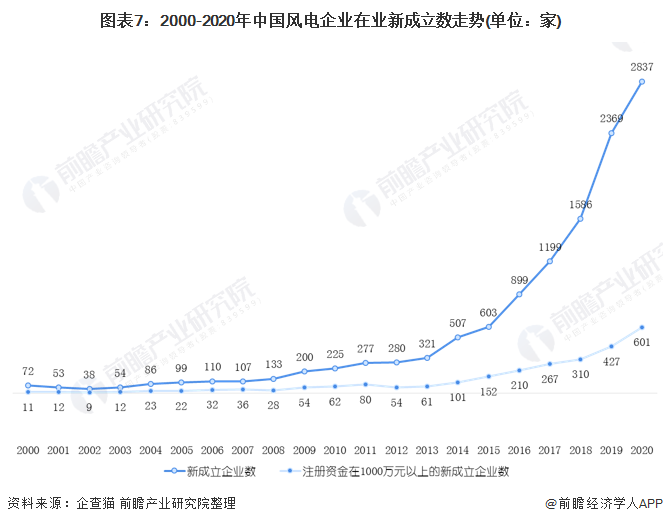 根據(jù)企查貓的數(shù)據(jù)顯示,自2000年來(lái),中國(guó)風(fēng)電相關(guān)新成立企業(yè)(在業(yè))的數(shù)量在近年來(lái)呈現(xiàn)大幅度攀升趨勢(shì)。在2013年僅僅只有321家新成立企業(yè),但截至2020年11月27日,2020年有2837家新成立企業(yè),較2013年上升了8.84倍。而注冊(cè)資金在1000萬(wàn)以上的新成立企業(yè)數(shù)在近年來(lái)呈現(xiàn)逐年上升趨勢(shì),在2013年僅有61家注冊(cè)資金在1000萬(wàn)以上的新成立企業(yè),2020年有601家新成立企業(yè),是2013年的10倍。因此,整體來(lái)看,中國(guó)風(fēng)電行業(yè)近年來(lái)發(fā)展如火如荼。