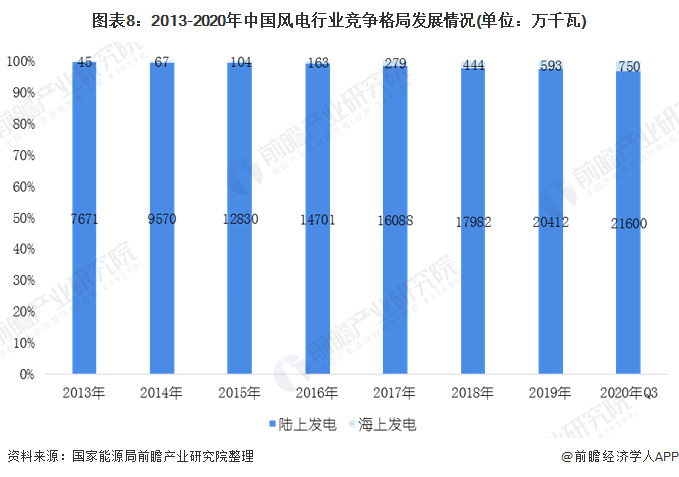 據(jù)國(guó)家能源局統(tǒng)計(jì)數(shù)據(jù)顯示,2013年以來(lái),我國(guó)海上風(fēng)電市場(chǎng)份額穩(wěn)步提升,2013年,海上風(fēng)電累計(jì)裝機(jī)容量為45萬(wàn)千瓦,僅占總體的0.58%,到2020年前三季度,增長(zhǎng)至750萬(wàn)千瓦,占總體的3.36%。預(yù)計(jì)未來(lái),海上風(fēng)電市場(chǎng)份額將進(jìn)一步提升。