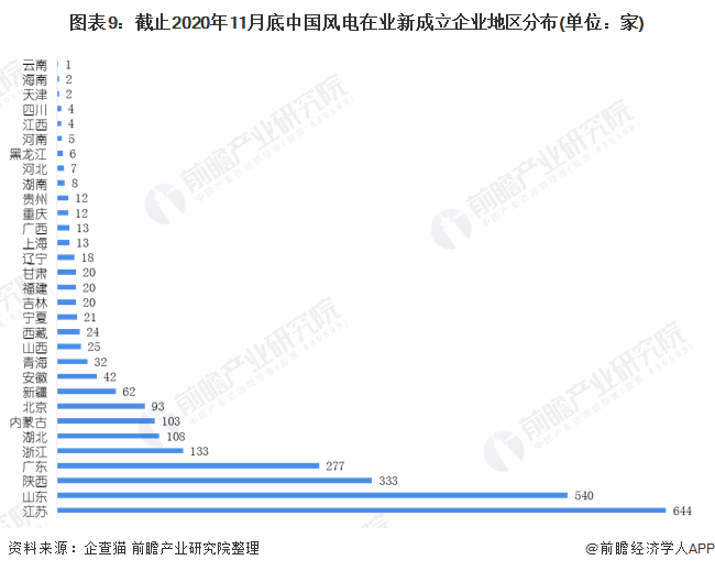 根據(jù)企查貓的數(shù)據(jù)顯示,截止2020年11月底江蘇以644家在業(yè)新成立企業(yè)占據(jù)全國(guó)第一的位置,緊追其后的是山東(540家),其次是陜西(332家)、廣東(277家)和浙江(133家)。