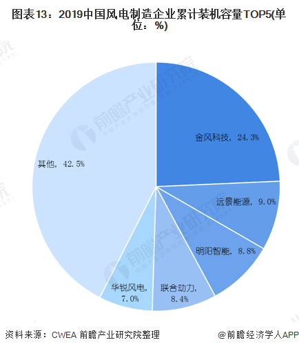 從市場(chǎng)份額來(lái)看,截止2019年底,金風(fēng)科技市場(chǎng)份額24.3%;其后依次為遠(yuǎn)景能源(9%)、明陽(yáng)智能(8.8%)、聯(lián)合動(dòng)力(8.4%)和華銳風(fēng)電(7%),前五家制造企業(yè)累計(jì)裝機(jī)容量占比合計(jì)為57.5%。