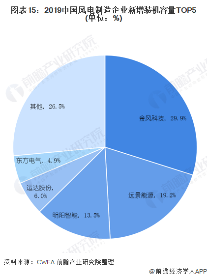 從市場(chǎng)份額來(lái)看,2019年,金風(fēng)科技市場(chǎng)份額達(dá)到30%;其后依次為遠(yuǎn)景能源(19.2%)、明陽(yáng)智能(13.5%)、運(yùn)達(dá)股份(6%)和東方電氣(4.9%),前五家制造企業(yè)新增裝機(jī)容量占比合計(jì)為73.4%。