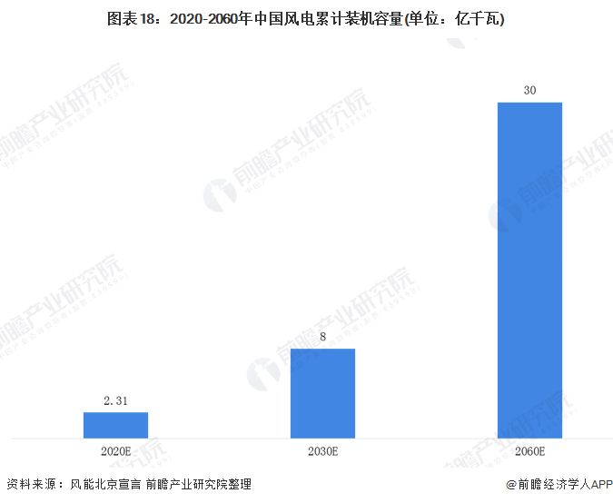 在2020年10月14日,來(lái)自全球400余家風(fēng)能企業(yè)的代表通過(guò)了《風(fēng)能北京宣言》,其指出積極推動(dòng)全球風(fēng)電健康快速發(fā)展,制定科學(xué)明確的中國(guó)風(fēng)電未來(lái)五年和中長(zhǎng)期發(fā)展規(guī)劃,并納入未來(lái)“碳中和國(guó)家”建設(shè)基本方略。綜合考慮資源潛力、技術(shù)進(jìn)步趨勢(shì)、并網(wǎng)消納條件等現(xiàn)實(shí)可行性,為達(dá)到與碳中和目標(biāo)實(shí)現(xiàn)起步銜接的目的,在“十四五”規(guī)劃中,須為風(fēng)電設(shè)定與碳中和國(guó)家戰(zhàn)略相適應(yīng)的發(fā)展空間:保證年均新增裝機(jī)5000萬(wàn)千瓦以上。2025年后,中國(guó)風(fēng)電年均新增裝機(jī)容量應(yīng)不低于6000萬(wàn)千瓦,到2030年至少達(dá)到8億千瓦,到2060年至少達(dá)到30億千瓦。