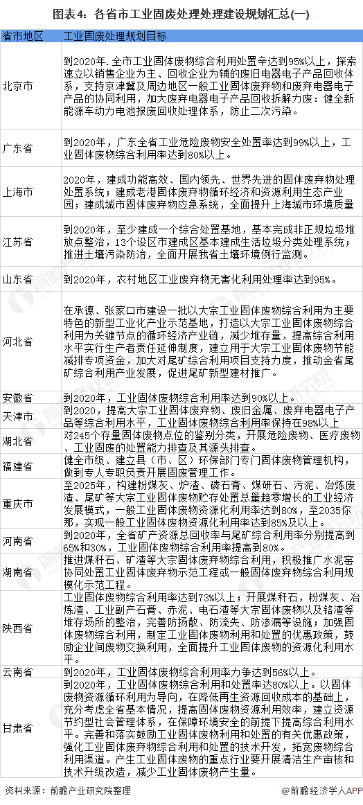 根據(jù)前瞻產(chǎn)業(yè)研究院匯總,截至2020年12月我國(guó)已經(jīng)有30多個(gè)省市地區(qū)就工業(yè)固廢處理的發(fā)展給出了相關(guān)的指導(dǎo)意見(jiàn)以及配套的措施,其中19個(gè)省份均已制定工業(yè)固廢處理綜合利用率階段性目標(biāo),并陸續(xù)出臺(tái)具體細(xì)化的地方性工業(yè)固廢處理政策扶持行業(yè)發(fā)展。