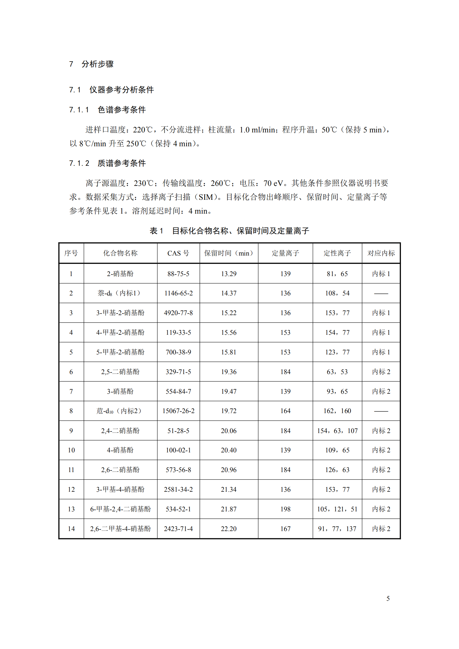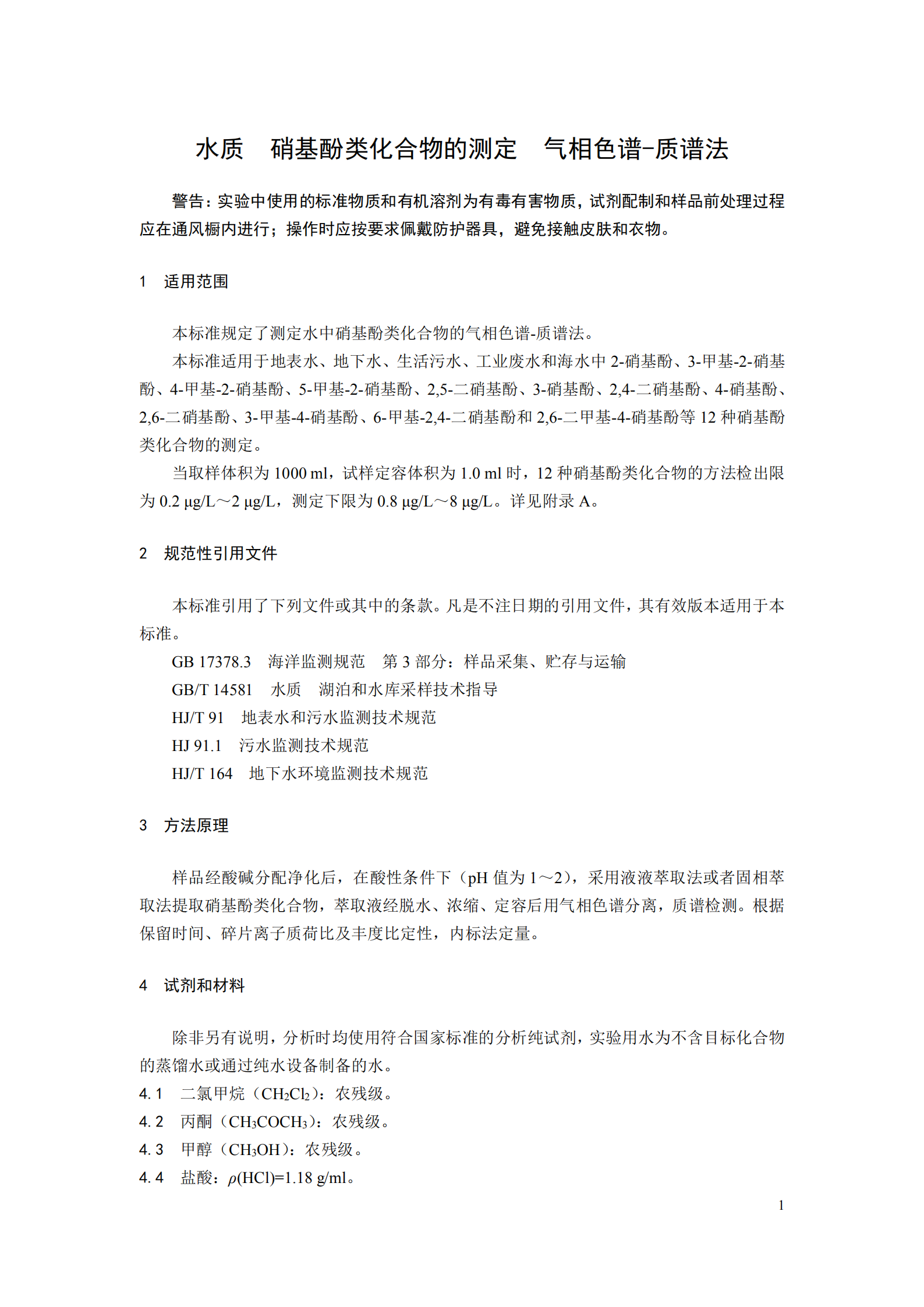 本標準規(guī)定了測定地表水、地下水、生活污水、工業(yè)廢水和海水中12種硝基酚類化合物 的氣相色譜-質(zhì)譜法。