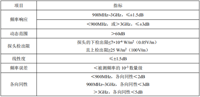 選頻式電磁輻射監(jiān)測(cè)儀是指能夠?qū)x器響應(yīng)頻率范圍內(nèi)某一特定發(fā)射的頻譜分量進(jìn)行接收和處理的場(chǎng)量監(jiān)測(cè)儀器,其電性能基本要求見(jiàn)表 1。