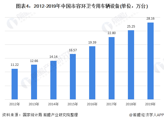 隨著我國道路清掃規(guī)模和生活垃圾清運規(guī)模擴大,環(huán)衛(wèi)用車需求不斷增加。環(huán)衛(wèi)作業(yè)車主要包括灑水車、洗掃車、護欄清洗車、掃路車、垃圾運輸車等。從我國市容環(huán)衛(wèi)專用車輛設(shè)備來看,2019年中國市容環(huán)衛(wèi)專用車數(shù)量達到28.16萬臺,2012-2019年年均復(fù)合增長率為14.05%。