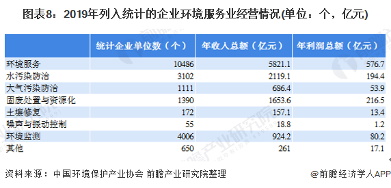 據(jù)環(huán)境保護產(chǎn)業(yè)協(xié)會數(shù)據(jù),2019年我國列入統(tǒng)計的環(huán)境服務企業(yè)共10486個,年收入總額為5281.1億元,年利潤總額為576.7億元。
