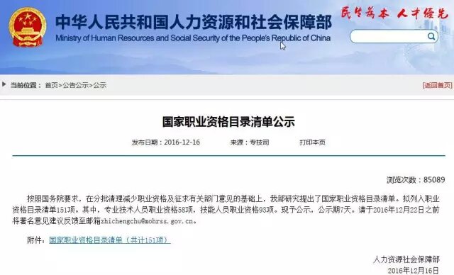 12月16日,人力資源社會保障部公示提出了國家職業(yè)資格目錄清單。擬列入職業(yè)資格目錄清單151項。其中,專業(yè)技術(shù)人員職業(yè)資格58項,技能人員職業(yè)資格93項。公示期7天,至2016年12月22日結(jié)束。