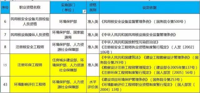 其中:涉及環(huán)境保護部實施的部門共5項,分別為:民用核安全設(shè)備無損檢驗人員資格、民用核設(shè)施操縱人員資格、注冊核安全工程師、注冊環(huán)保工程師為準入類,環(huán)境影響評價工程師為水平評價類。