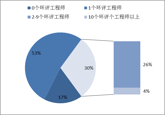 在6626家環(huán)評編制單位中,1162個(gè)環(huán)評編制單位有0個(gè)環(huán)評工程師、占比17.5%,3486個(gè)環(huán)評編制單位有1個(gè)環(huán)評工程師、占比52.6%,合計(jì)超過70%,僅有250家環(huán)評編制單位有10個(gè)以上環(huán)評工程師,僅占4%,詳見圖3。