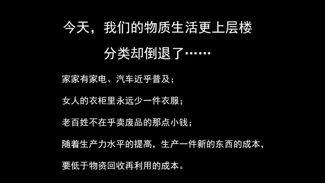 但是大家發(fā)現(xiàn)沒有到了今天,我們家里面有房、有車、有衣服、有書,有各種各樣的東西充滿了家里面,我們垃圾分類工作卻倒退了。