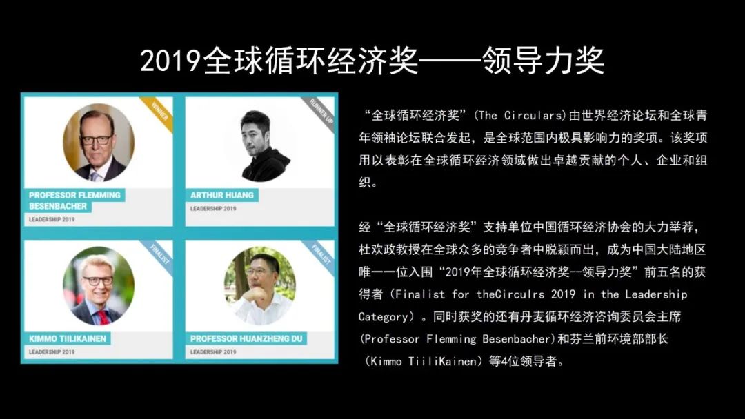 從我們國家來講,全國200多個大中城市,每年會產生2億多噸的垃圾,這個量非常大,如果中國的垃圾分類工作做好了,全世界的循環(huán)經濟的工作就做好了三分之一,所以達沃斯世界經濟論壇設立了一個全球循環(huán)經濟獎,專門獎勵這方面的企業(yè)和領導人、專家,很榮幸在2019年,我作為中國大陸唯一的一個人入圍了它的領導力獎。