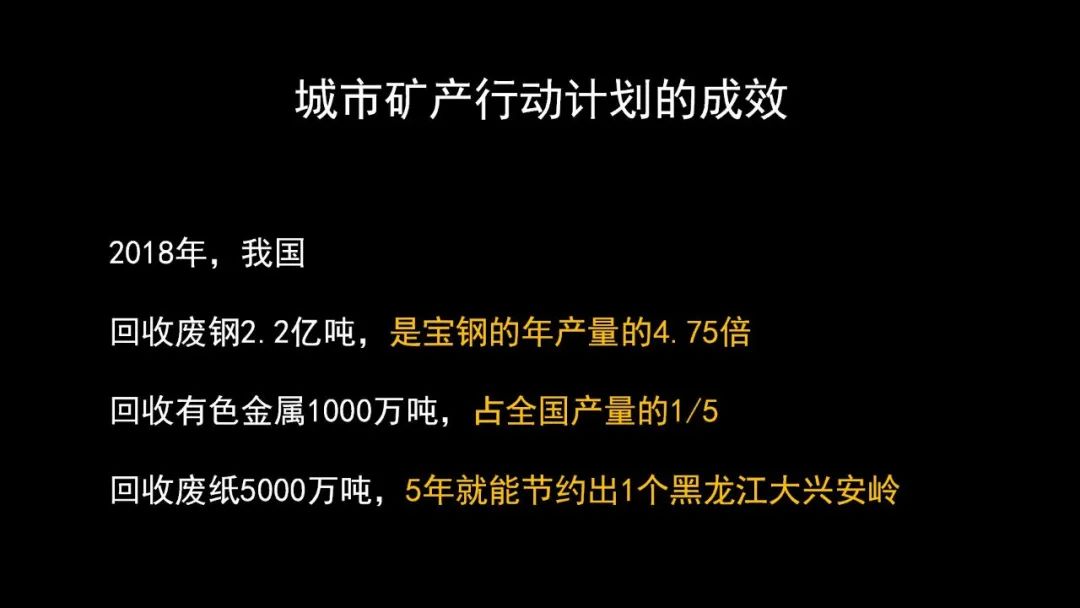 從2009年我們實施城市礦產行動計劃,到2018年,有什么樣的效果呢,大家看這幾組數(shù)據(jù)就知道了。2018年,我們回收的廢鋼鐵是2.2億噸,大概相當于中國寶鋼2018年產量的4.75倍;我們回收的再生有色金屬是1000萬噸,當年我們有色金屬產量是什么呢?5000萬噸,占了全年的五分之一;2018年回收的廢紙是5000萬噸,這5000萬噸廢紙如果連續(xù)5年回收使用,相當于我們一個大興安嶺的森林來解決我們用紙的問題。