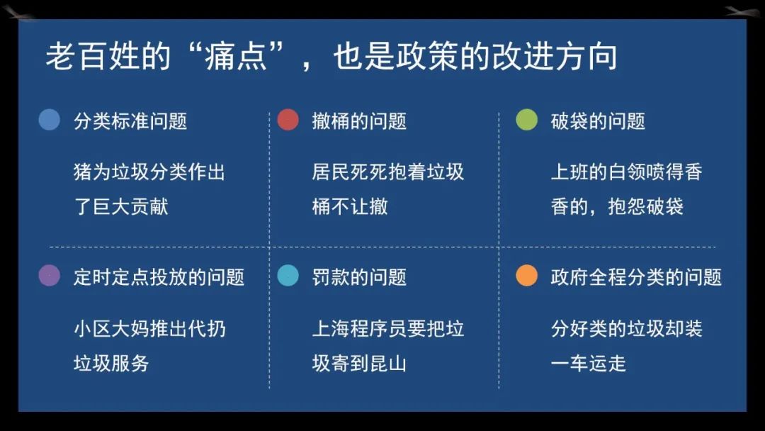 當然除了分類的標準以外,還有撤桶的問題、破袋的問題、還有定時定點投放的問題、還有罰款的問題、還有政府是不是全程分類的問題,這些都是每個老百姓關注的。