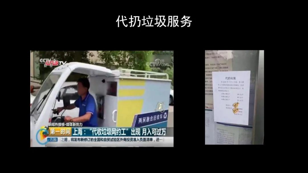 上海有大量的年輕人上班 996,定時定點投放垃圾,到這個時間我在上班我沒辦法投,怎么辦?這也是大家提出來的問題,所以有些年輕人就想了辦法,干脆我的垃圾請人代扔,我給你錢,這叫代扔垃圾;