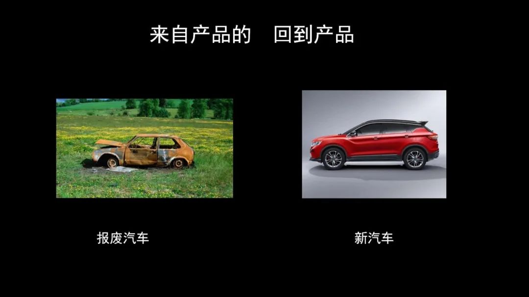 我們家報廢的舊汽車,把里面的金屬,把里面的銅鋁 鐵、塑料回收,可能變成你家接下來要的新汽車,我想這就是來自產品,回到產品。