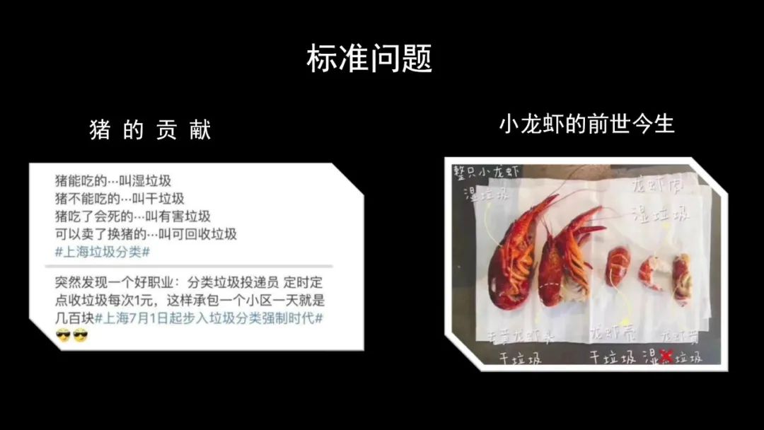 “豬能吃的叫濕垃圾,豬不能吃的叫干垃圾,豬吃了會死的叫有害垃圾,賣了能買豬肉吃的叫做可回收垃圾”,很形象吧,這是標準的問題;
