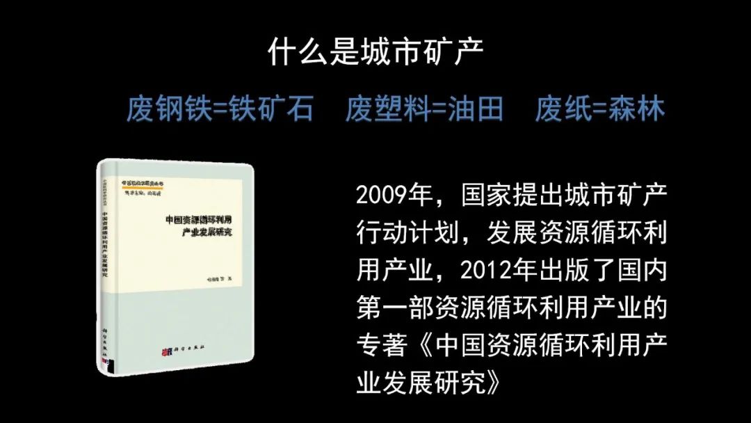 所以我們就提出了一個概念叫做:城市礦產。我們的礦產在城市里面,我們在座的每一位都是城市礦產的采掘工,廢鋼鐵就是鐵礦石,廢塑料就是石油,廢紙就是森林,這就是一個城市礦產的概念。