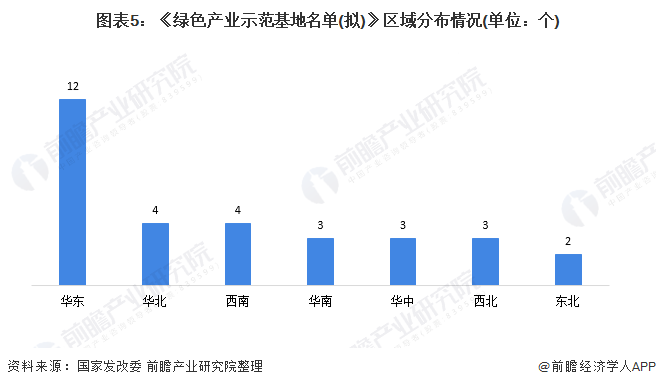 綠色產(chǎn)業(yè)園是綠色產(chǎn)業(yè)的一個(gè)聚集群落,其主導(dǎo)產(chǎn)業(yè)包括節(jié)能環(huán)保、清潔生產(chǎn)、清潔能源等六大產(chǎn)業(yè)。根據(jù)上海市出臺了《綠色產(chǎn)業(yè)園區(qū)評價(jià)導(dǎo)則》,節(jié)能減排、循環(huán)利用等“綠色運(yùn)營”指標(biāo)是綠色產(chǎn)業(yè)園的主要特征。2020年7月,國家發(fā)改委正式開展綠色產(chǎn)業(yè)示范基地建設(shè)工作;2020年12月,《綠色產(chǎn)業(yè)示范基地名單(擬)》公布,共有31個(gè)基地入選,其中分布在華東地區(qū)的基地?cái)?shù)量最多,達(dá)12個(gè)。