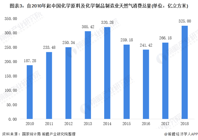 2010-2018年,我國(guó)化學(xué)原料及化學(xué)制品制造業(yè)天然氣消費(fèi)總量呈現(xiàn)波動(dòng)狀態(tài)。2010年,我國(guó)天然氣化工消費(fèi)量為187.28億立方米,2014年上升至320.28億立方米。受煤炭?jī)r(jià)格大幅走低的影響,近年來(lái)天然氣化工消費(fèi)量增長(zhǎng)乏力。2018年,我國(guó)化學(xué)原料及化學(xué)制品制造業(yè)天然氣消費(fèi)總量為325億立方米。
