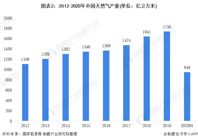 2012-2019年,中國(guó)天然氣產(chǎn)量逐年遞增,增速波動(dòng)變化。根據(jù)國(guó)家統(tǒng)計(jì)局?jǐn)?shù)據(jù),2019年,中國(guó)天然氣產(chǎn)量為1736.2億立方米,較上年同期增長(zhǎng)了5.8%,增速在經(jīng)過(guò)了三年上升后開(kāi)始下降。2020年上半年中國(guó)天然氣勘探力度基本不變而產(chǎn)量繼續(xù)強(qiáng)勁增長(zhǎng),天然氣產(chǎn)量為948.3億立方米,同比增長(zhǎng)7.91%。