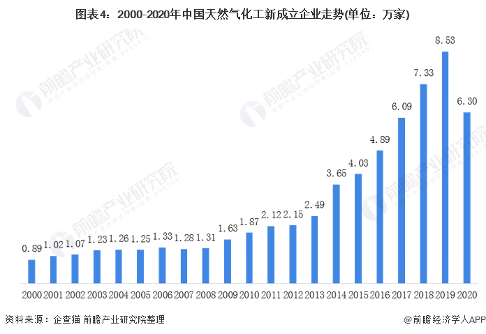從新成立企業(yè)數(shù)來(lái)看,2000-2020年中國(guó)天然氣化工新成立企業(yè)呈現(xiàn)逐年上升趨勢(shì)。自2013年起,中國(guó)天然氣化工新成立企業(yè)出現(xiàn)爆發(fā)式增長(zhǎng);在2019年達(dá)到了峰值8.53萬(wàn)家。2020年,中國(guó)天然氣化工新成立企業(yè)有6.3萬(wàn)家。