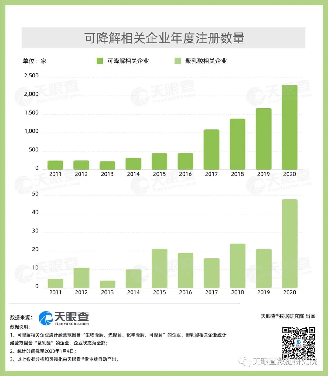 我國(guó)目前經(jīng)營(yíng)范圍含“生物降解、光降解、化學(xué)降解、可降解”,且狀態(tài)為在業(yè)、存續(xù)、遷入、遷出的可降解相關(guān)企業(yè)近8,400家。地域分布上看,我國(guó)可降解相關(guān)企業(yè)主要分布在云南省,近5,000家相關(guān)企業(yè),占全國(guó)近6成。廣東省以超670家相關(guān)企業(yè)位居第二位,安徽省和山東省均有超過(guò)300家相關(guān)企業(yè)。近十年來(lái),我國(guó)可降解相關(guān)企業(yè)(全部企業(yè)狀態(tài))年度注冊(cè)數(shù)量與增速呈穩(wěn)定上漲趨勢(shì)。截至目前,以工商登記為準(zhǔn),天眼查專(zhuān)業(yè)版數(shù)據(jù)顯示,我國(guó)2020年新增可降解相關(guān)企業(yè)近2,300家,較去年同比增長(zhǎng)38%。“升級(jí)版”限塑令規(guī)定:全國(guó)范圍餐飲行業(yè)禁止使用不可降解的一次性塑料吸管。很多人在2021年的第一天發(fā)現(xiàn),原先奶茶店、快餐店、烘焙咖啡店提供的一次性塑料吸管不見(jiàn)了,它們或被換成了紙質(zhì)吸管,或被改成了聚乳酸可降解吸管,還有的被可以直接飲用的杯蓋代替了。中國(guó)消費(fèi)者報(bào)在報(bào)道中指出,聚乳酸可降解吸管,是以玉米、甘蔗等作物為原料,經(jīng)過(guò)一系列復(fù)雜工藝生產(chǎn)而成。在堆肥的條件下,只需要90天就會(huì)降解完成。不過(guò),這些可降解產(chǎn)品目前共同面臨著原材料供應(yīng)比較緊張的問(wèn)題。我國(guó)目前經(jīng)營(yíng)范圍含“聚乳酸”,且狀態(tài)為在業(yè)、存續(xù)、遷入、遷出的聚乳酸相關(guān)企業(yè)近200家。截至目前,以工商登記為準(zhǔn),我國(guó)2020年新增聚乳酸相關(guān)企業(yè)(全部企業(yè)狀態(tài))約48家,同比增長(zhǎng)近129%。來(lái)源 | 天眼查數(shù)據(jù)研究院
