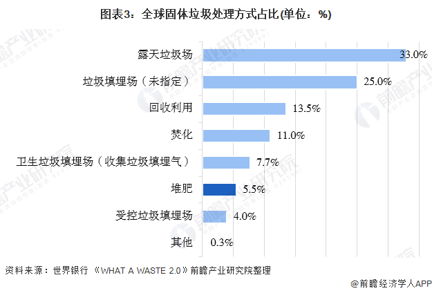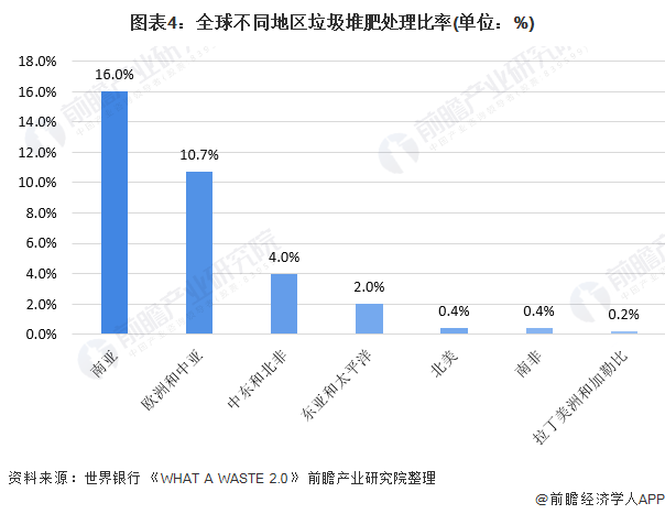 《WHAT A WASTE 2.0》中公布的數(shù)據(jù)顯示,全球固體垃圾處理中采用堆肥方式進(jìn)行處理的比重為5.5%,不同地區(qū)選擇堆肥處理垃圾的比重不同,其中南亞地區(qū)堆肥處理垃圾的比重最高,達(dá)16%,其次為歐洲和中亞地區(qū),這一地區(qū)堆肥處理垃圾的比重為10.7%。