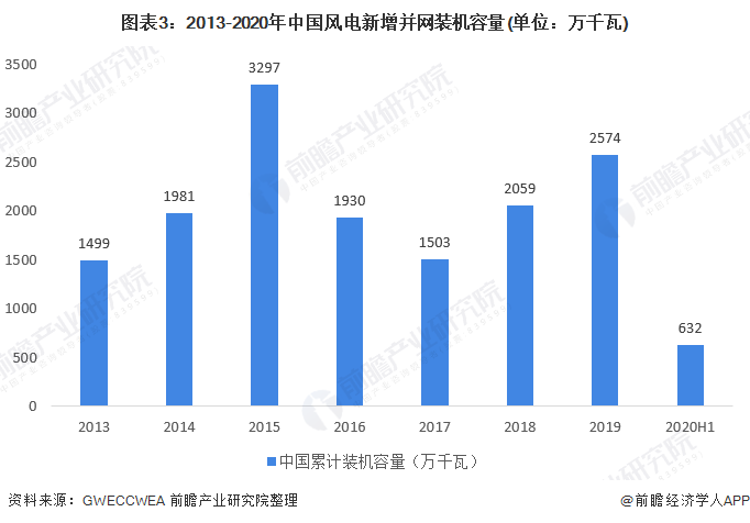 風(fēng)電裝機(jī)容量逐年增長(zhǎng)。據(jù)統(tǒng)計(jì),2019年我國(guó)風(fēng)電裝機(jī)容量達(dá)到了21005萬(wàn)千瓦。2020年上半年,我國(guó)風(fēng)電裝機(jī)容量達(dá)到了21675萬(wàn)千瓦,其中新增風(fēng)電并網(wǎng)裝機(jī)容量632萬(wàn)千瓦。