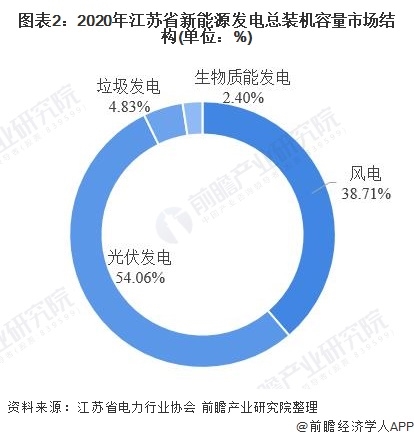 從新能源發(fā)電結(jié)構來看,截至2020年11月,江蘇省風電裝機容量1196.47萬千瓦,占新能源發(fā)電總裝機容量的38.71%;太陽能發(fā)電裝機容量1670.63萬千瓦,占新能源發(fā)電總裝機容量的54.06%;垃圾發(fā)電裝機容量149.38萬千瓦,占新能源發(fā)電總裝機容量的4.83%;生物質(zhì)發(fā)電裝機容量74.12萬千瓦,占新能源發(fā)電總裝機容量的2.40%。