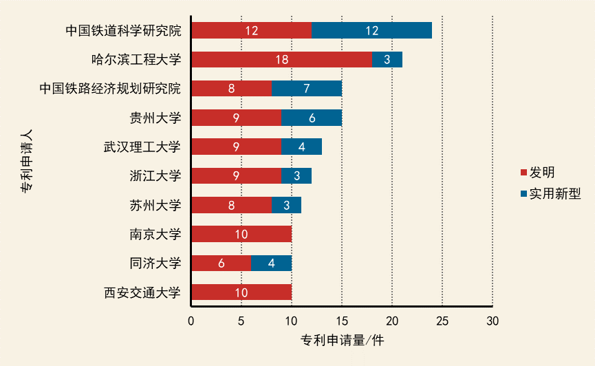 中國國內(nèi)院校在該技術(shù)領(lǐng)域的專利申請(qǐng)量偏少。排在前三位的高校/科研院所分別是中國鐵道科學(xué)研究院、哈爾濱工程大學(xué)、中國鐵路經(jīng)濟(jì)規(guī)劃研究院。