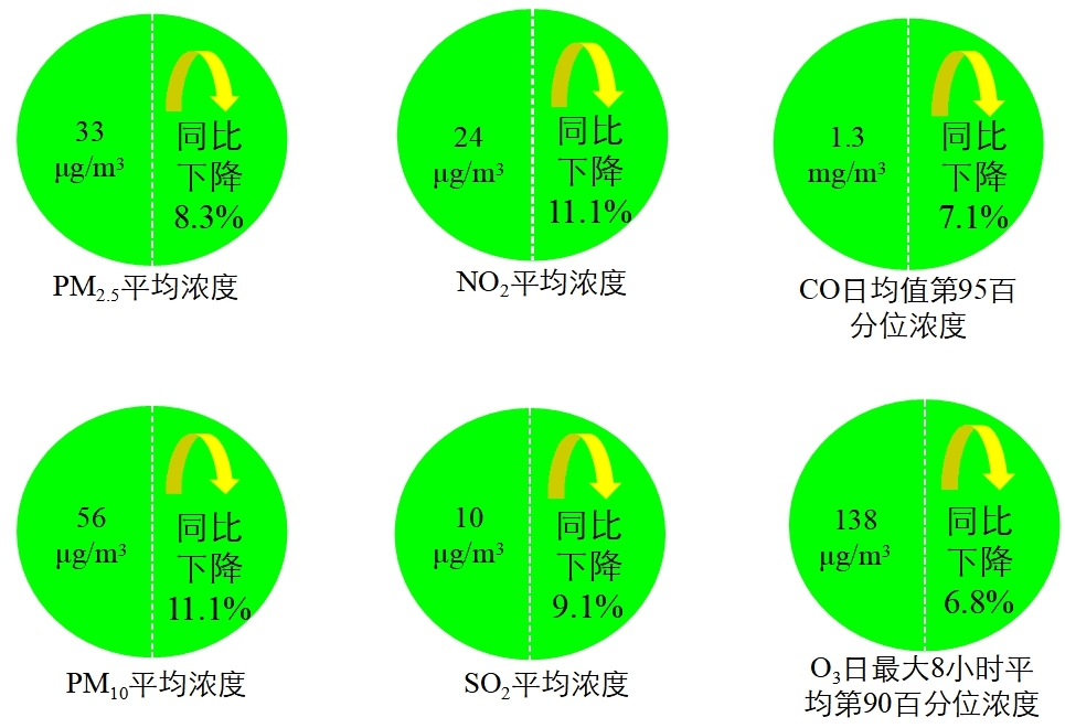 1-12月,全國337個(gè)地級及以上城市平均優(yōu)良天數(shù)比例為87.0%,同比上升5.0個(gè)百分點(diǎn);PM2.5平均濃度為33微克/立方米,同比下降8.3%;PM10平均濃度為56微克/立方米,同比下降11.1%;O3平均濃度為138 微克/立方米,同比下降6.8%;SO2平均濃度為10微克/立方米,同比下降9.1%;NO2平均濃度為24 微克/立方米,同比下降11.1%;CO平均濃度為1.3毫克/立方米,同比下降7.1%。
