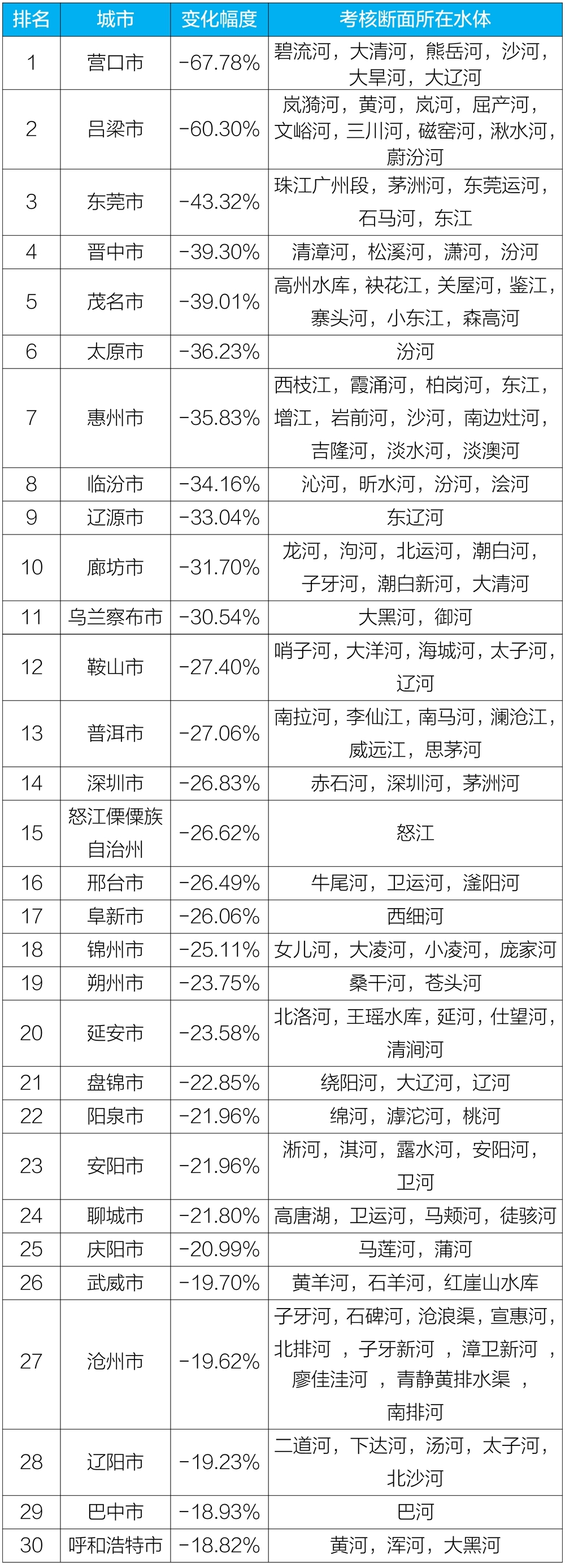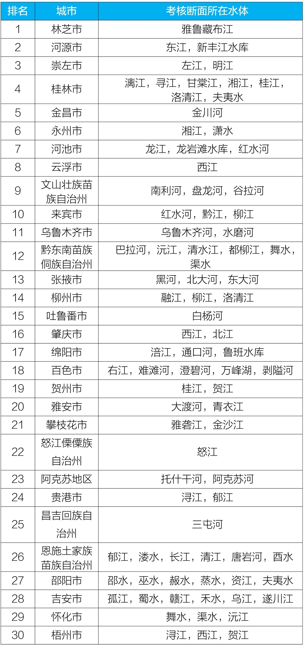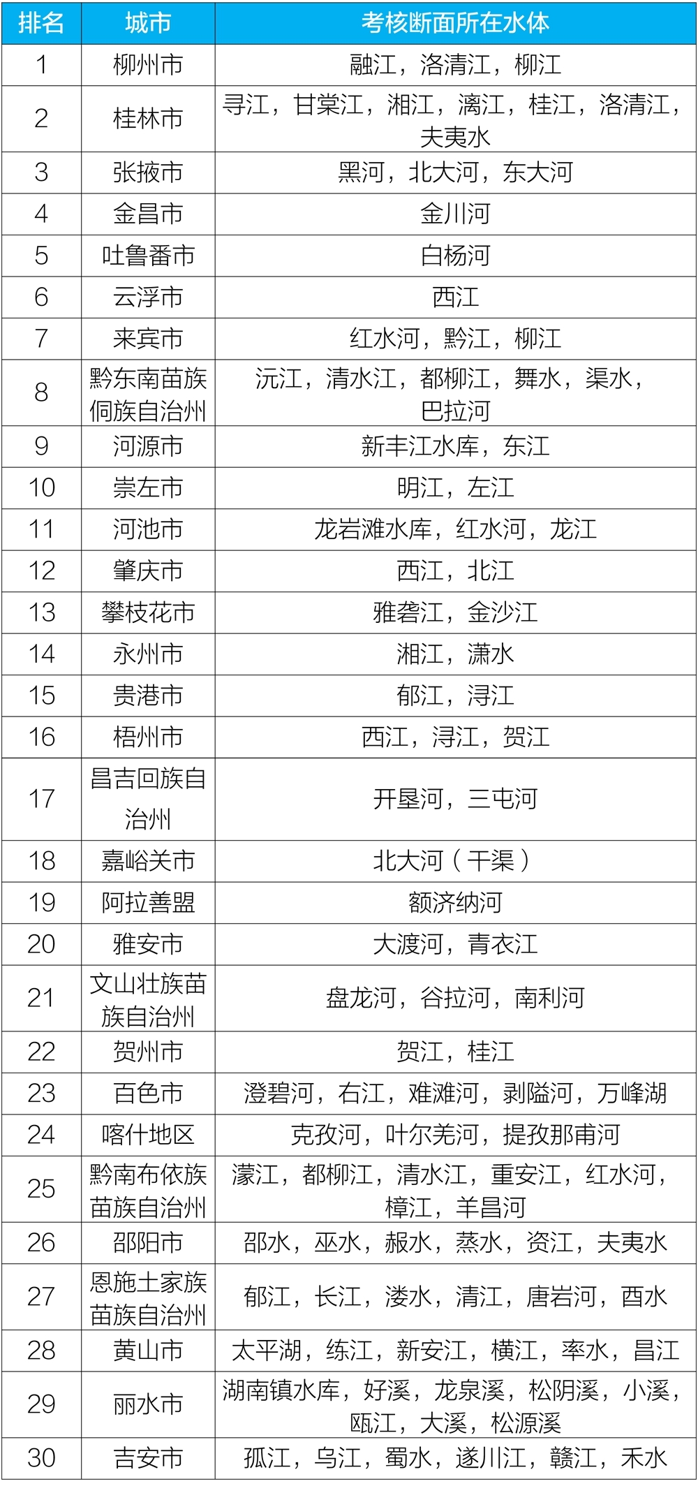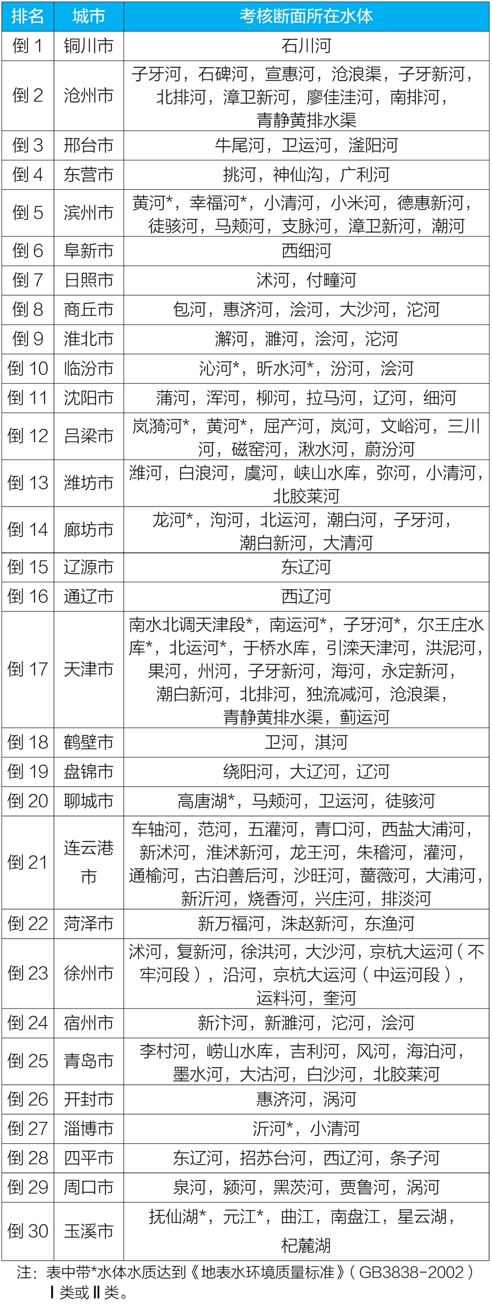 地級及以上城市國家地表水考核斷面排名