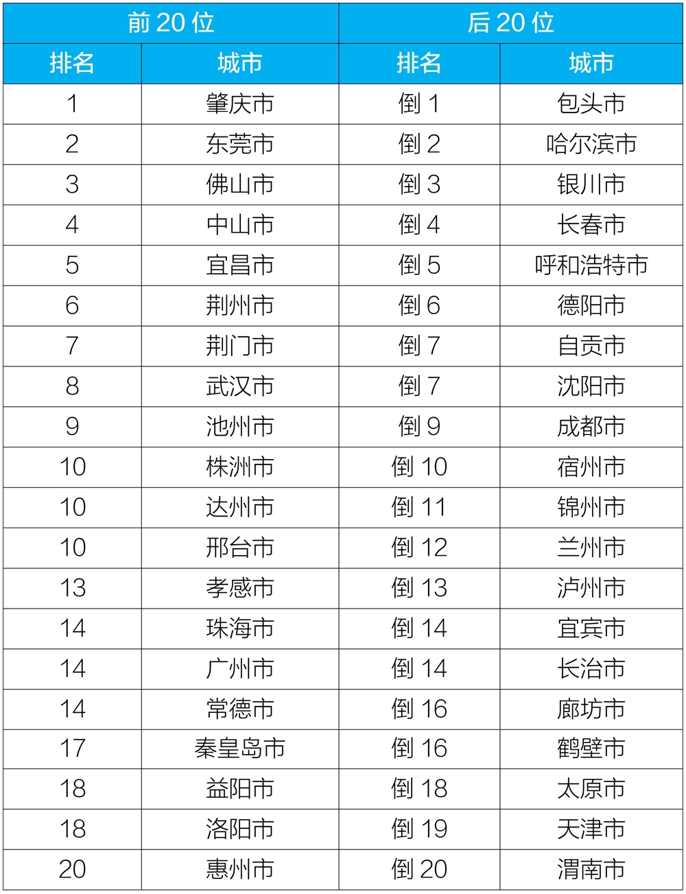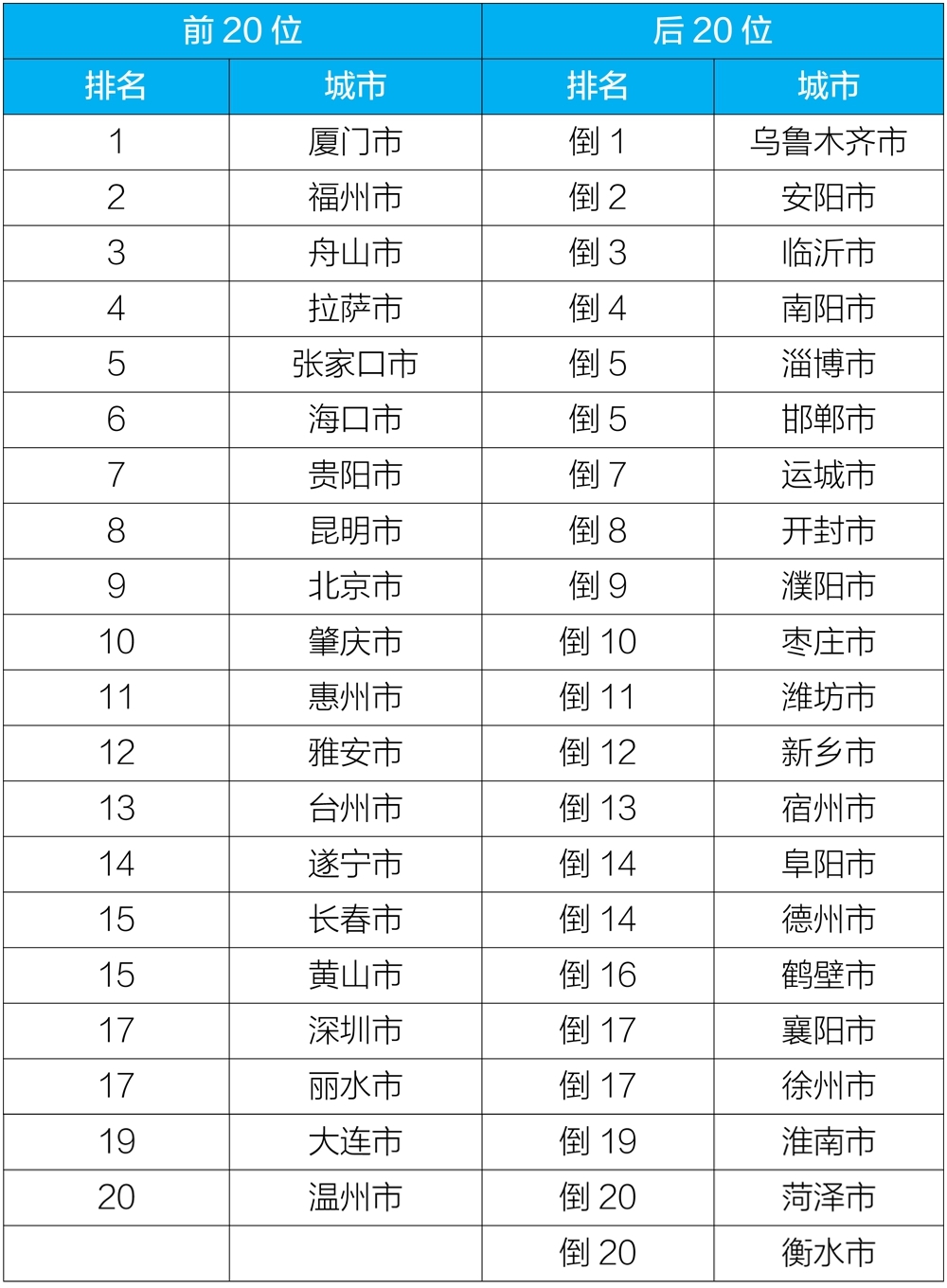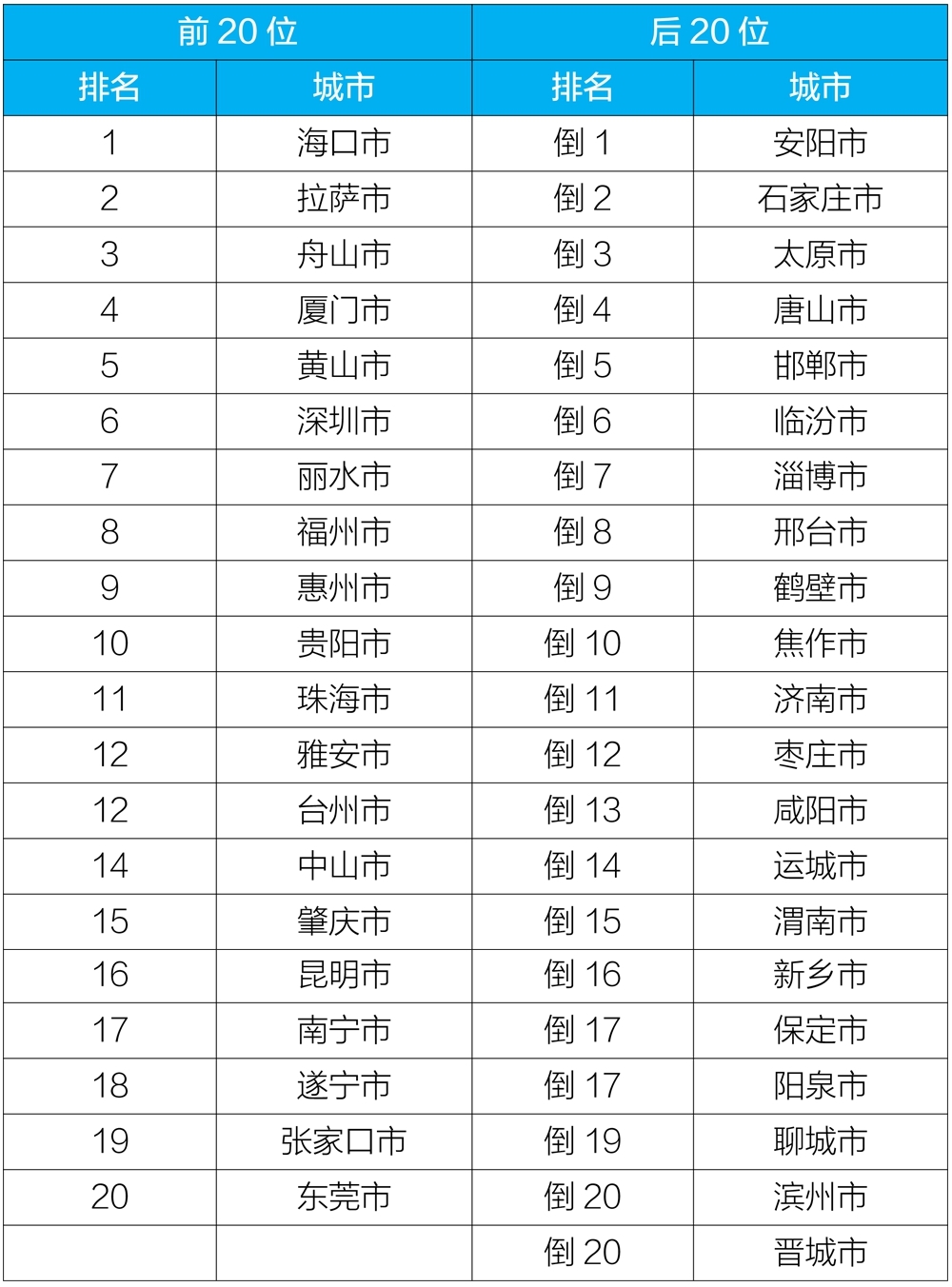 2020年12月168個(gè)重點(diǎn)城市排名前20位和后20位城市名單